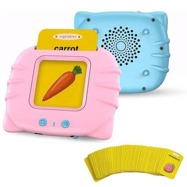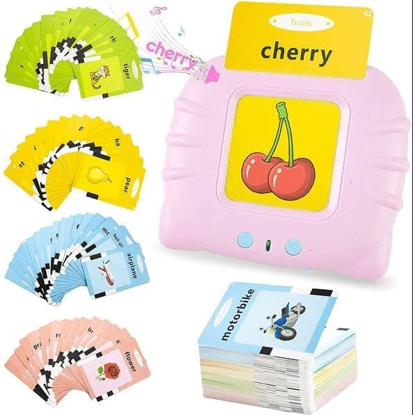 O brinquedo acompanha um cabo carregador USB e 112 cartões (frente e verso) totalizando 224 palavras diferentes.